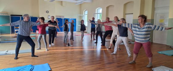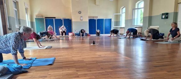 Yoga, unter Anleitung von Rosemarie Knops, auf der Matte und/oder auf dem Stuhl für Junggebliebene und/oder für Teilnehmer mit Bewegungseinschränkungen.
